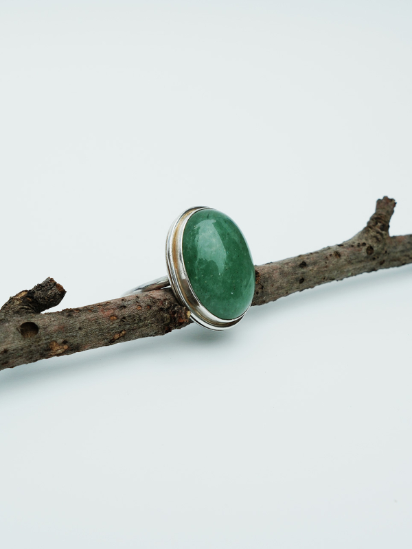 A beautiful Adventurine cabachon stone is set in sterling silver. This ring is a women's size 9.
